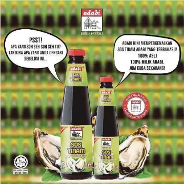 Lebih banyak produk akan menemui anda semua dari semasa ke semasa. Dapatkan produk baharu sos berperisa tiram adabi, keluaran adabi consumer industries sdn bhd di pasar. Sos tiram adabi adalah antara produk yang sering digunakan untuk memasak, tetapi persoalan utama yang timbul sekarang ini adalah, adakah ianya merupakan produk asli keluaran adabi?. Sos tiram adabi (510g) rm 6.00. Maklumat pengilang dan pengeluar sebenar produk sos tiram adabi boleh dirujuk pada botol produk tersebut.