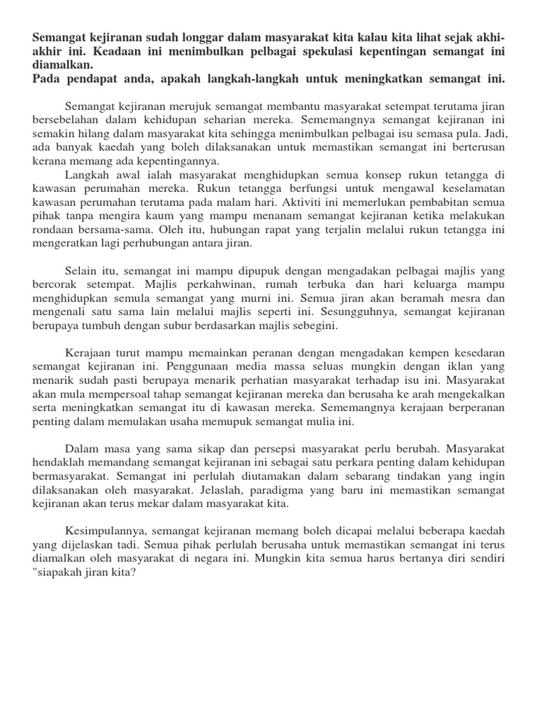 Contoh karangan langkah usaha memupuk semangat kejiranan dalam kalangan masyarakat malaysia. Selain itu, semangat kejiranan juga penting kerana dapat membentuk semangat kekitaan dan melahirkan masyarakat yang bersatu padu. Sudah terang lagi bersuluh, semakin hari kita semakin menghampiri ambang 2020. Secara tidak langsung aktiviti ini merapatkan hubungan antara jiran tetangga. No.17, taman permai indah kesedaran semangat kejiranan mampu membawa kepada jaminan keselamatan penduduk setempat.